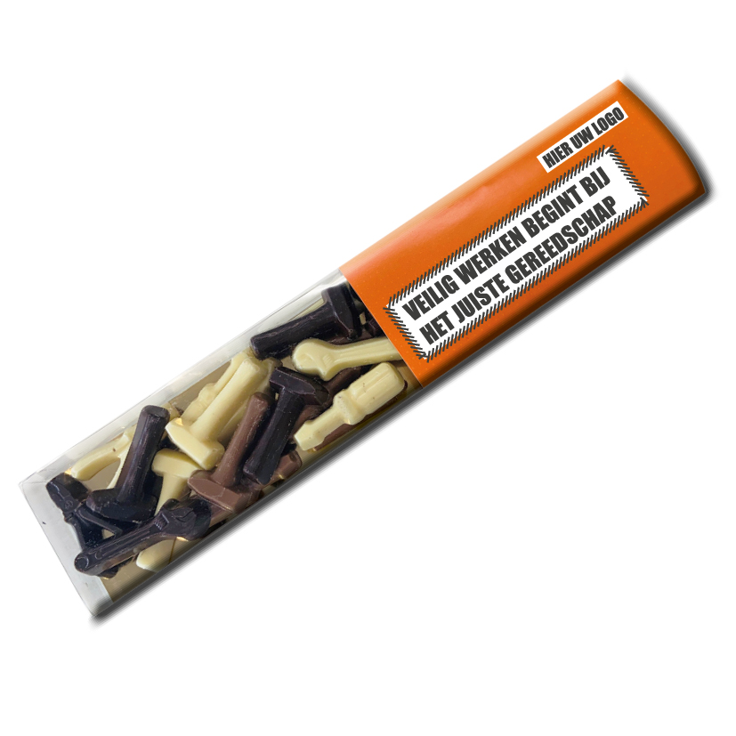 Ontdek de heerlijke zoete verleiding van Belgische chocolade in de vorm van gereedschapjes! Vers geproduceerd bij opdracht Laat je smaakpapillen dansen met elke hap van onze heerlijke en ambachtelijk gemaakte chocolade. Perfect om mee te bouwen, te delen en vooral te genieten. Snel leverbaar en altijd mooi te personaliseren met bijvoorbeeld een banderol met daarop de tekst: "Samen bouwen wij aan de toekomst/Aan een relatie bouwen" of een eigen ontwerp.